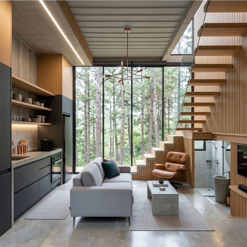 Wnętrze domku to symfonia betonu, drewna i światła. Zapomnij o ciasnocie – dzięki ogromnym przeszkleniom granica między salonem a lasem zaciera się, a Ty zyskujesz poczucie nieograniczonej przestrzeni.