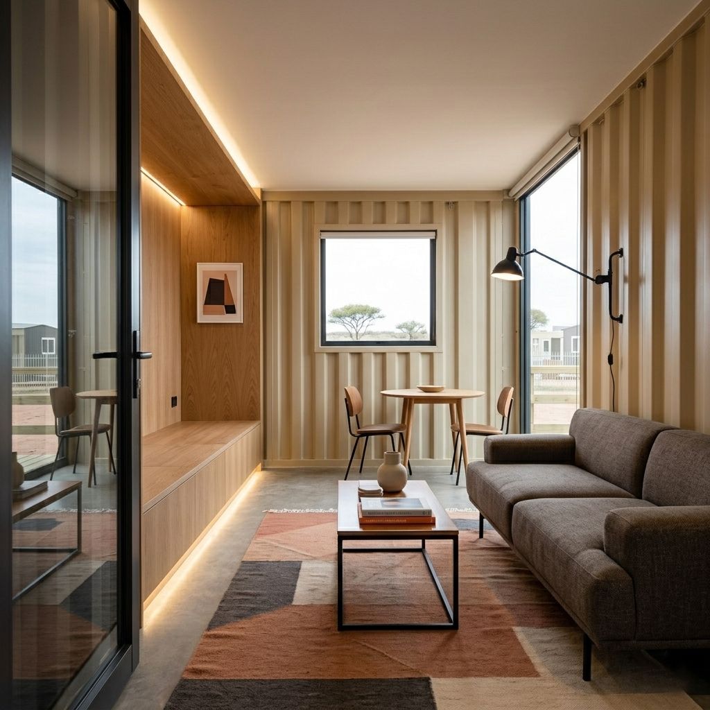 Prawdziwe Połączenie Stylów: We wnętrzu, które prezentujemy, surowy, falowany metal ścian kontenera (w modnym odcieniu beżu) spotyka się z ciepłem i elegancją zabudowy meblowej z forniru dębowego. To unikalne zestawienie nadaje przestrzeni niepowtarzalny, industrialno-skandynawski charakter.
